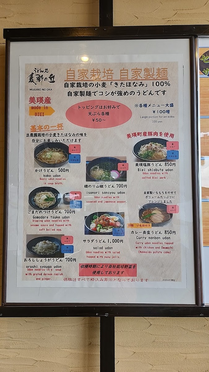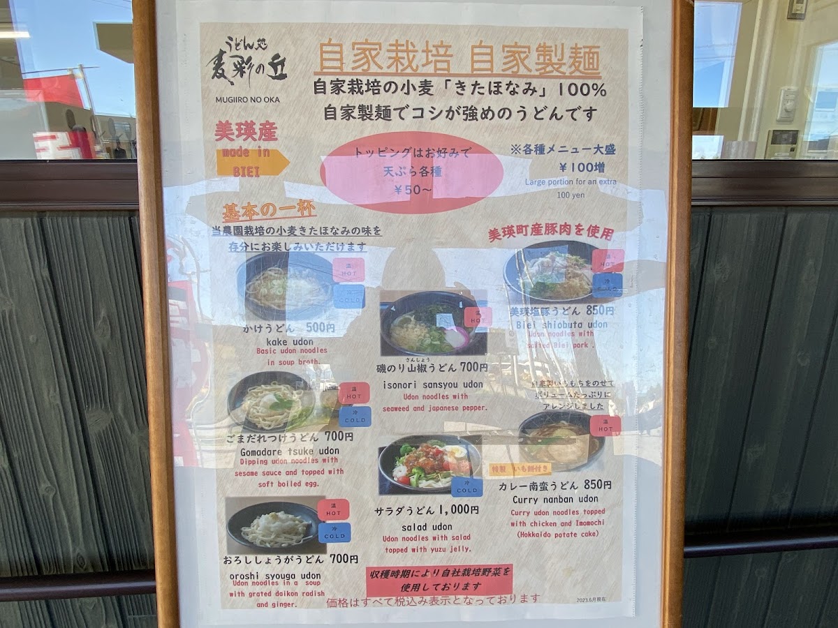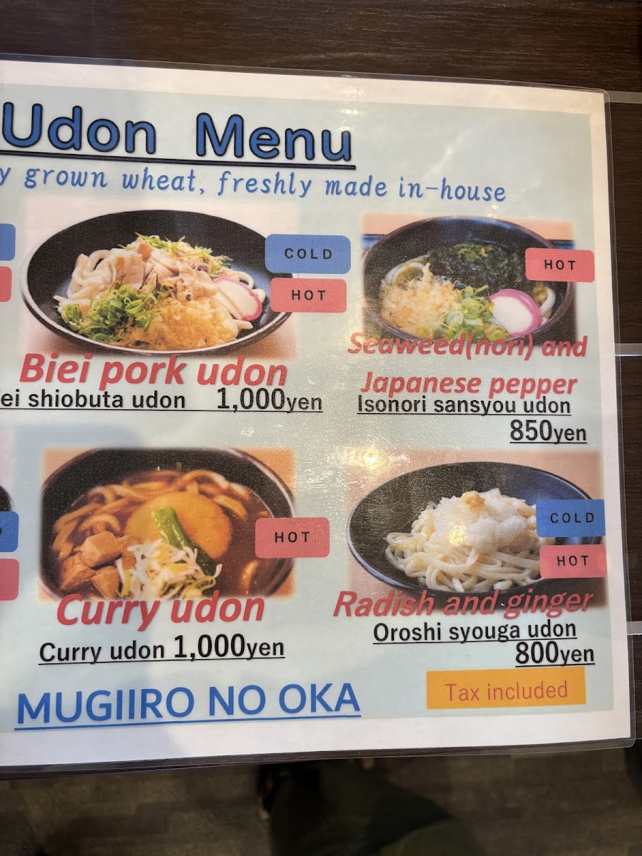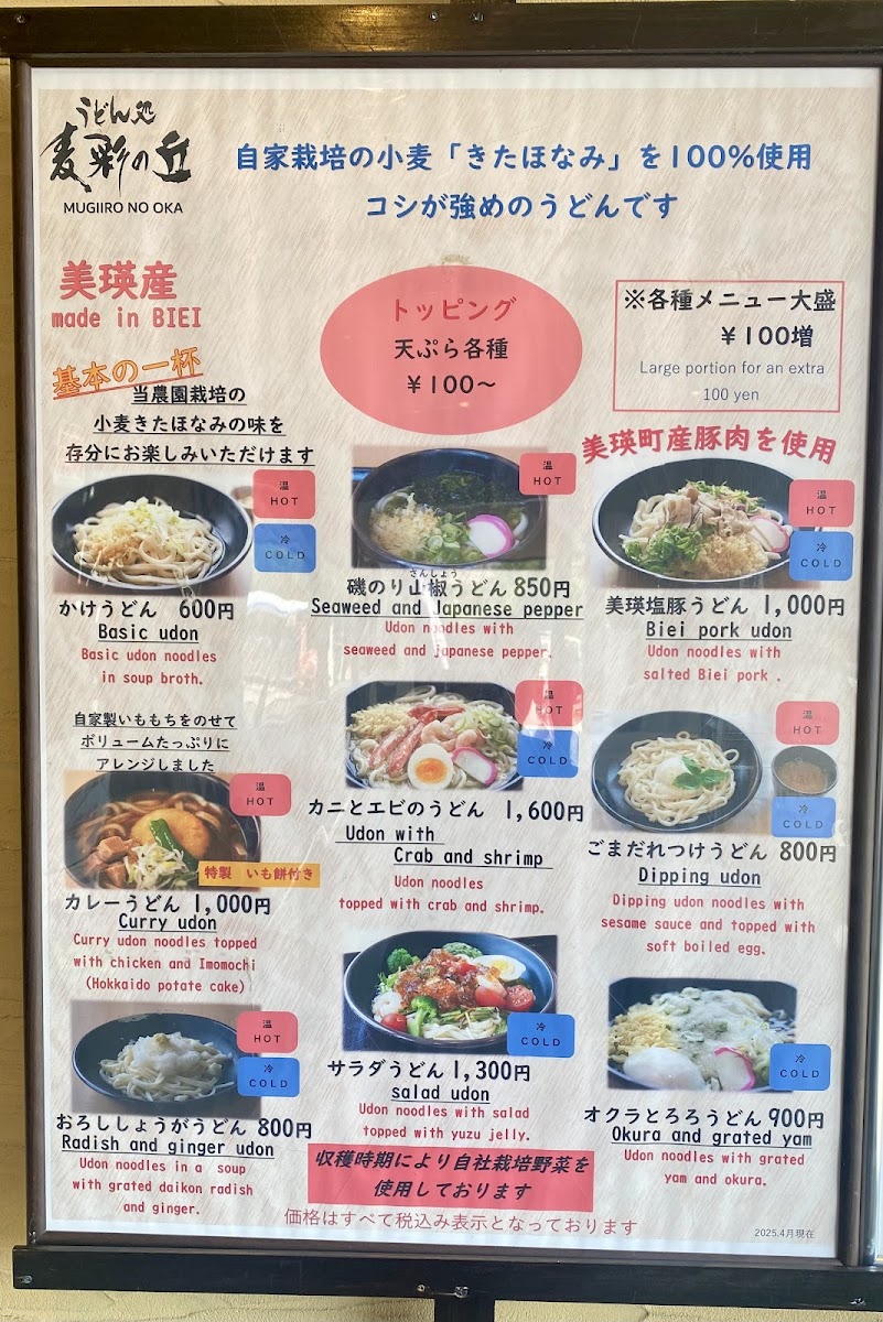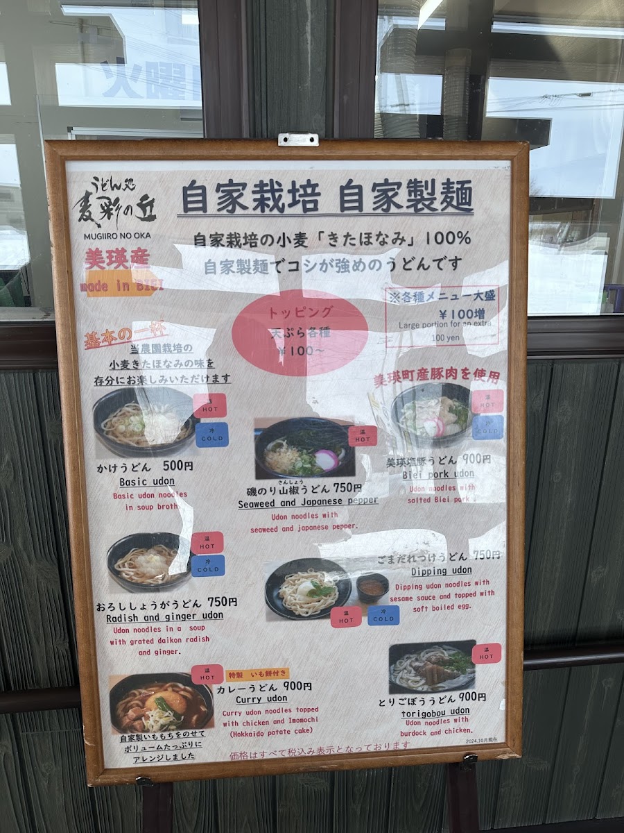 The menu at Mugiiro No Oka presents a focused yet expressive take on udon, where simplicity and regional character work hand in hand. Classic comfort is delivered through かけうどん かき揚げ えび天追加, pairing clean, soothing broth with the crunch of kakiage and the indulgence of added shrimp tempura, while かけうどんと野菜天 keeps things lighter with crisp seasonal vegetables. For deeper, more aromatic flavors, カレー南蛮うどん stands out with its warming curry-infused soup, contrasted nicely by the refreshing sharpness of おろし生姜うどん, where grated ginger brightens every bite. Local identity is strongly expressed in 美瑛塩豚うどん&ちくわ天&いか天, a hearty combination that balances savory salt-seasoned pork with the satisfying textures of chikuwa and squid tempura. Cold udon options show the kitchen’s creative range, from ネギ塩豚うどん 冷 に帆立炊き込みご飯追加, which layers chilled noodles, fragrant scallions, and salt-seasoned pork alongside a comforting addition of scallop takikomi rice, to トマトソースつけうどん 冷, an unexpected yet refreshing pairing that uses tomato sauce as a dipping base, adding acidity and sweetness to the firm noodles. For diners seeking bolder, more distinctive notes, 山椒烏龍麵 introduces a numbing, citrusy spice that leaves a memorable impression. Beyond udon, the menu also reflects Hokkaido’s adventurous side with 鹿肉罐頭 熊肉罐頭, offering canned venison and bear meat as rare regional specialties that underscore the restaurant’s connection to local food culture. Taken together, the menu feels cohesive and thoughtfully curated, balancing traditional udon foundations with inventive variations and regional ingredients, making it satisfying for both first-time visitors and those eager to explore deeper flavors.