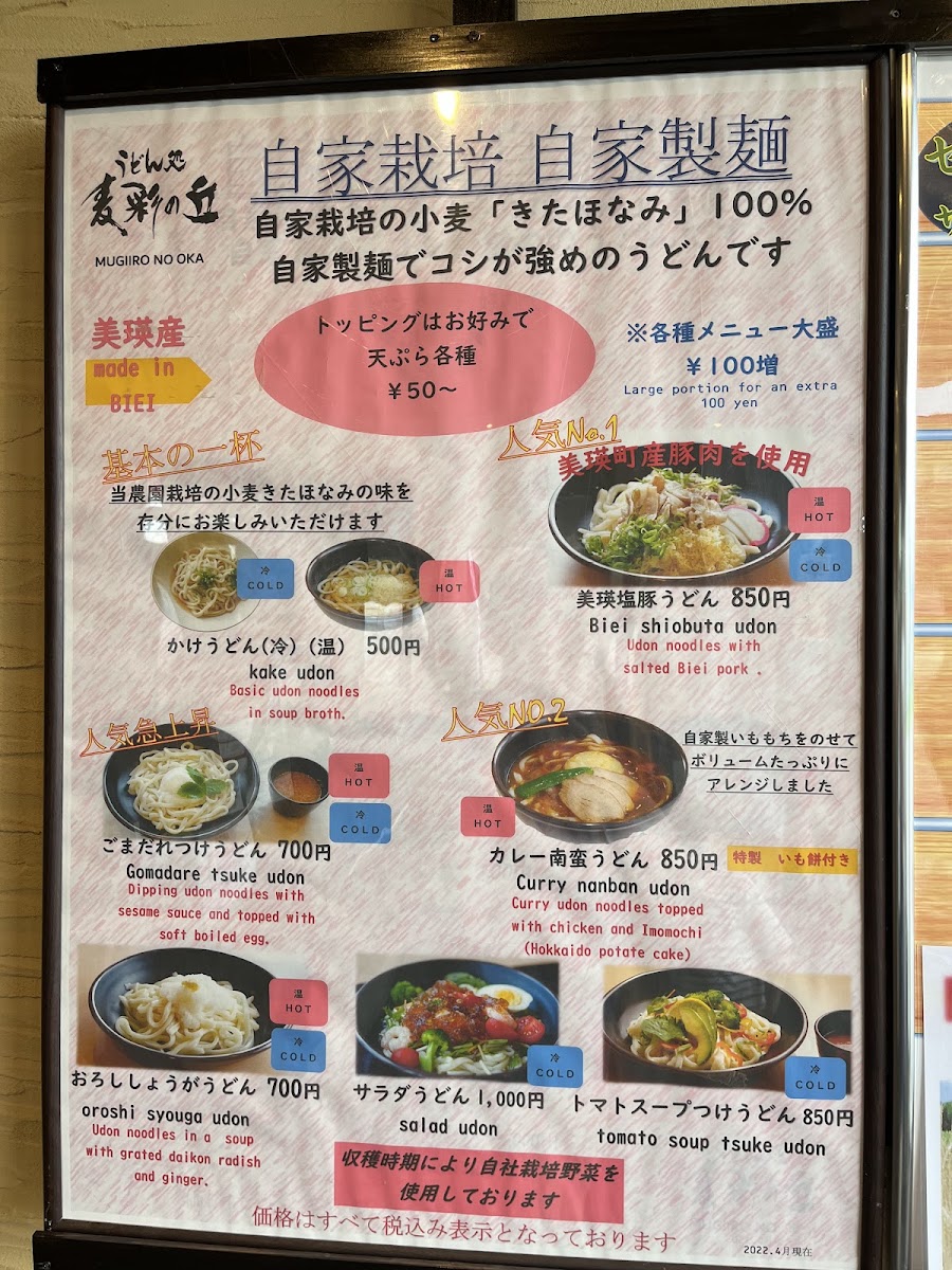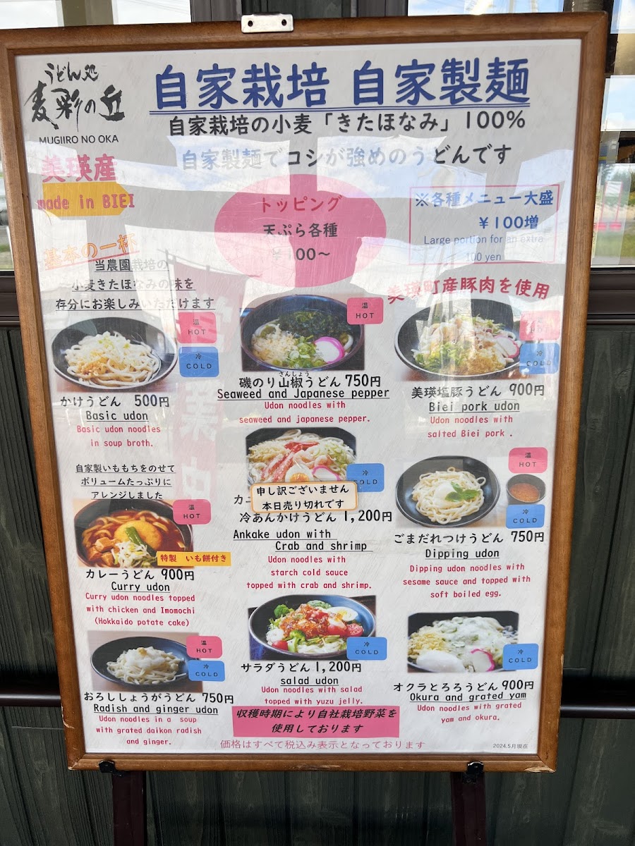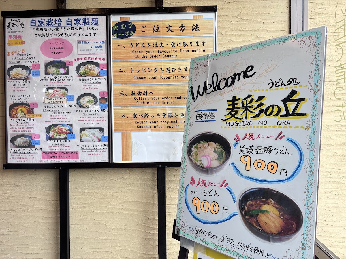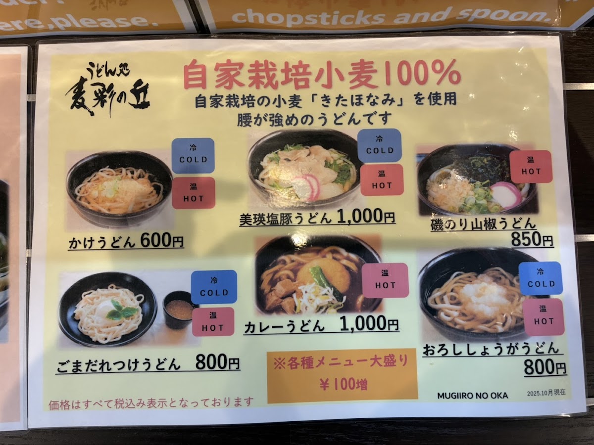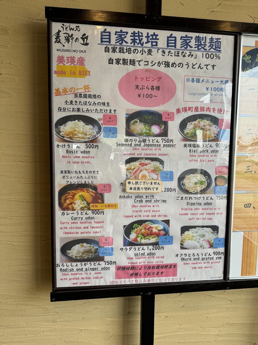 The menu at Mugiiro No Oka presents a focused yet expressive take on udon, where simplicity and regional character work hand in hand. Classic comfort is delivered through かけうどん かき揚げ えび天追加, pairing clean, soothing broth with the crunch of kakiage and the indulgence of added shrimp tempura, while かけうどんと野菜天 keeps things lighter with crisp seasonal vegetables. For deeper, more aromatic flavors, カレー南蛮うどん stands out with its warming curry-infused soup, contrasted nicely by the refreshing sharpness of おろし生姜うどん, where grated ginger brightens every bite. Local identity is strongly expressed in 美瑛塩豚うどん&ちくわ天&いか天, a hearty combination that balances savory salt-seasoned pork with the satisfying textures of chikuwa and squid tempura. Cold udon options show the kitchen’s creative range, from ネギ塩豚うどん 冷 に帆立炊き込みご飯追加, which layers chilled noodles, fragrant scallions, and salt-seasoned pork alongside a comforting addition of scallop takikomi rice, to トマトソースつけうどん 冷, an unexpected yet refreshing pairing that uses tomato sauce as a dipping base, adding acidity and sweetness to the firm noodles. For diners seeking bolder, more distinctive notes, 山椒烏龍麵 introduces a numbing, citrusy spice that leaves a memorable impression. Beyond udon, the menu also reflects Hokkaido’s adventurous side with 鹿肉罐頭 熊肉罐頭, offering canned venison and bear meat as rare regional specialties that underscore the restaurant’s connection to local food culture. Taken together, the menu feels cohesive and thoughtfully curated, balancing traditional udon foundations with inventive variations and regional ingredients, making it satisfying for both first-time visitors and those eager to explore deeper flavors.